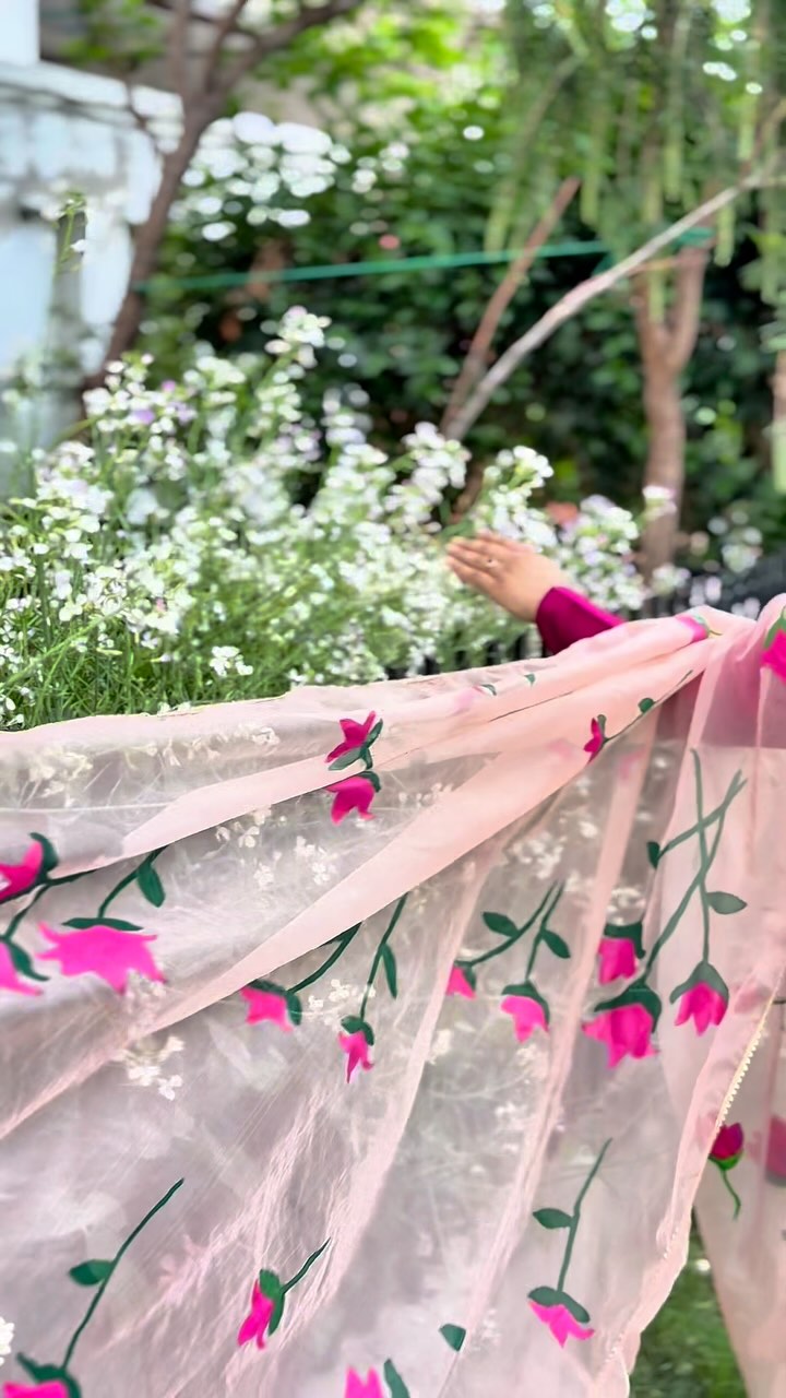 Add a touch of feminine grace to your wardrobe with this handcrafted organza dupatta. The transparent blush-pink fabric is adorned with vibrant hand-embroidered flowers in deep pink and green tones, creating a timeless and romantic look. Whether paired with a kurta, anarkali, or lehenga, this dupatta instantly elevates any outfit.